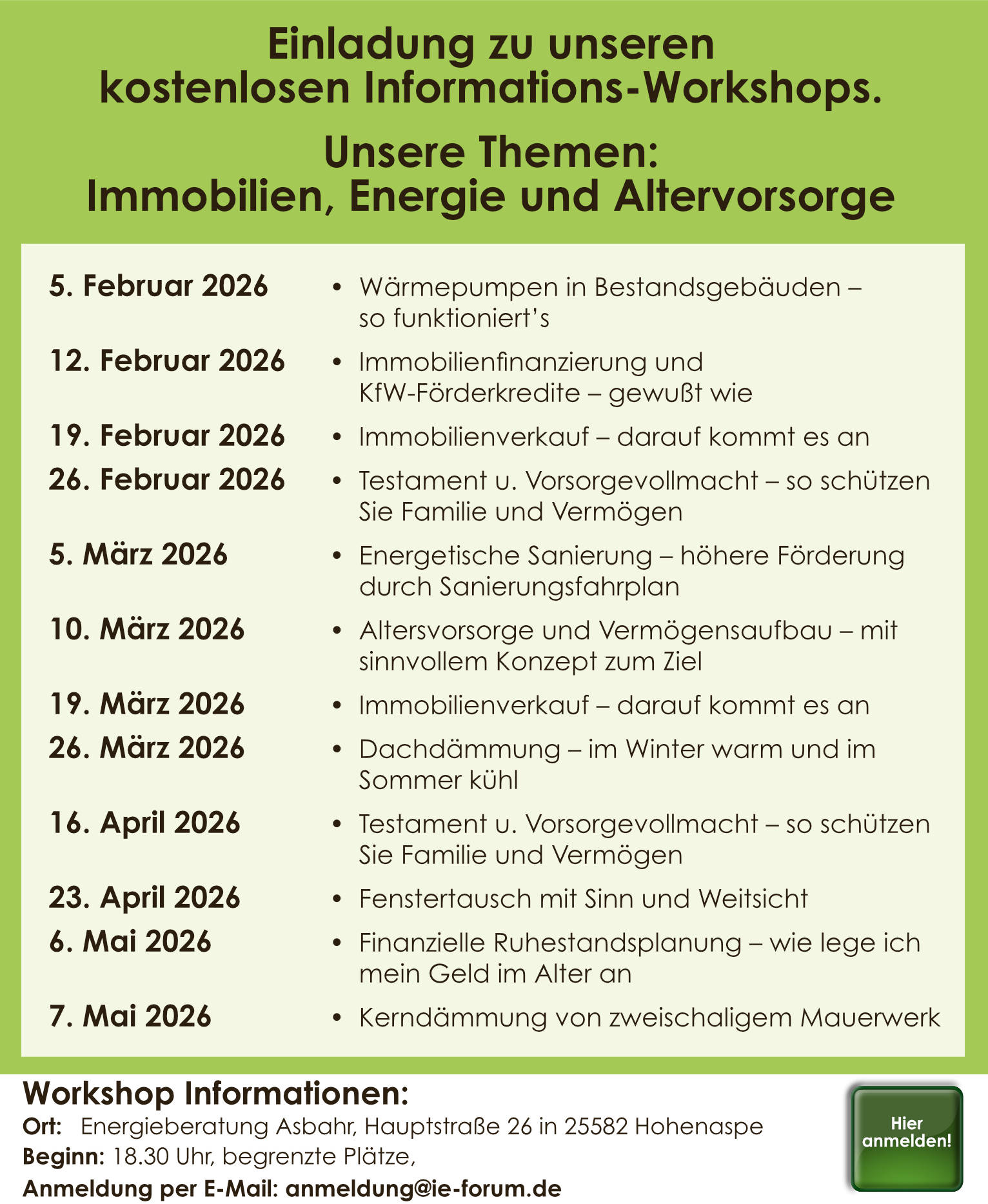 Das FORUM IMMOBILIEN & ENERGIE ist ein Zusammenschluss regionaler Unternehmen, die es sich zur Aufgabe gemacht haben, gemeinschaftlich rund um Immobilien- und Energiethemen fachkompetent zu beraten und zu informieren. In diesem Jahr führen wir eine Reihe von interessanten Workshops durch. Unser Ziel ist es, in kleinen Gruppen in den Austausch zu gehen, um so noch effektiver und gezielter informieren zu können.